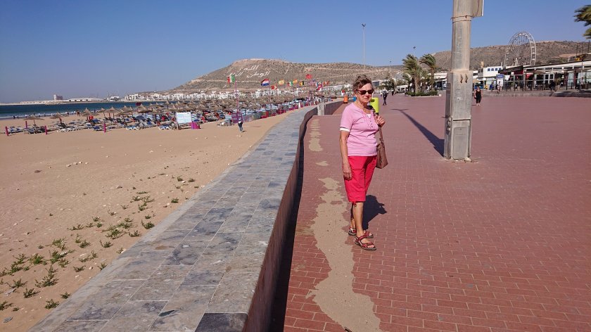 Ingen blåst på morgonen och lite kyligare än de senaste dagarna men ändå +21. Vid tiotiden går vi till strandpromenaden och följer den söderut tills den tar slut och bara sandstranden fortsätter.