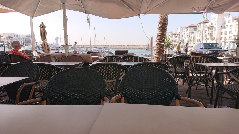 Det serverades bara vatten men det var OK att ta med en eget vin så jag hämtar en flaska vitt. 180 MAD totalt ink en flaska vatten. Sedan blev det mellon på datorn i husbilen.