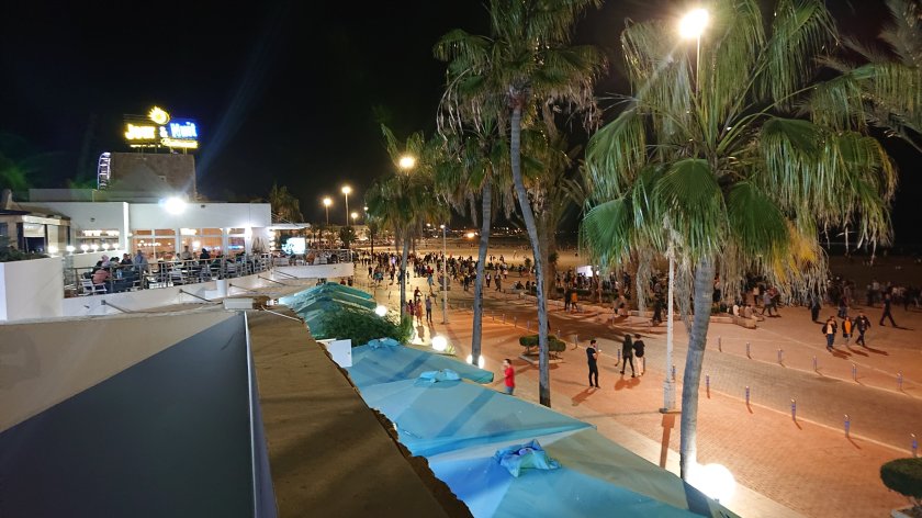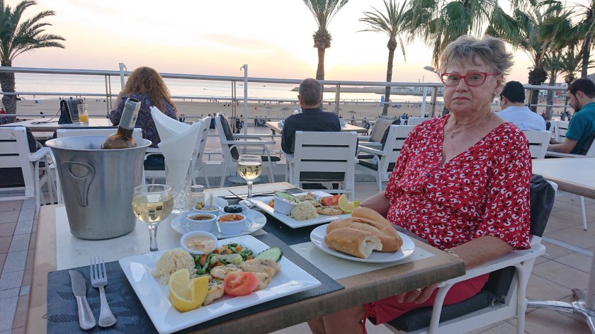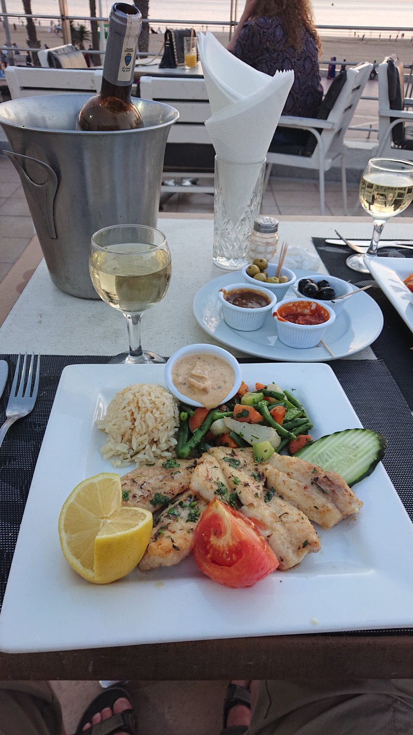 Vi beställde fisk och en flaska vitt. Total kostnad 318 DIR. Mycket folk flanerade på strandpromenaden hela kvällen. I husbilen var det så varmt att vi körde luftkonditioneringen för första gången på två år.
