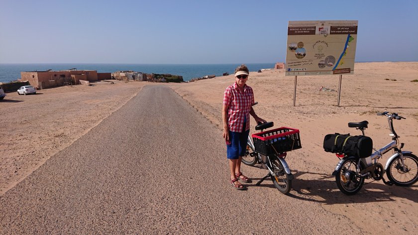 Vi tog plats 6 och det var precis att bilen fick plats. Det är sol och +23 grader. Efter lunch och trekaffet cyklar vi ner till havet. Vägen går genom ett ökenlandskap.