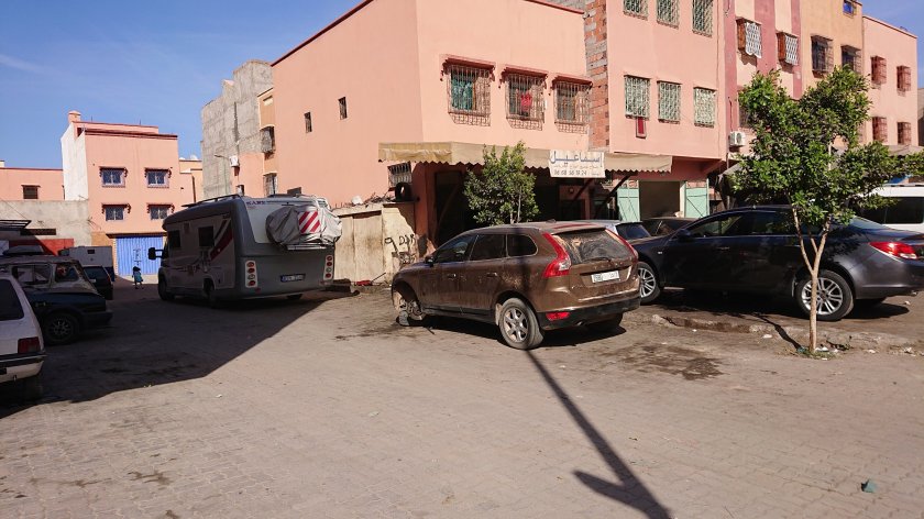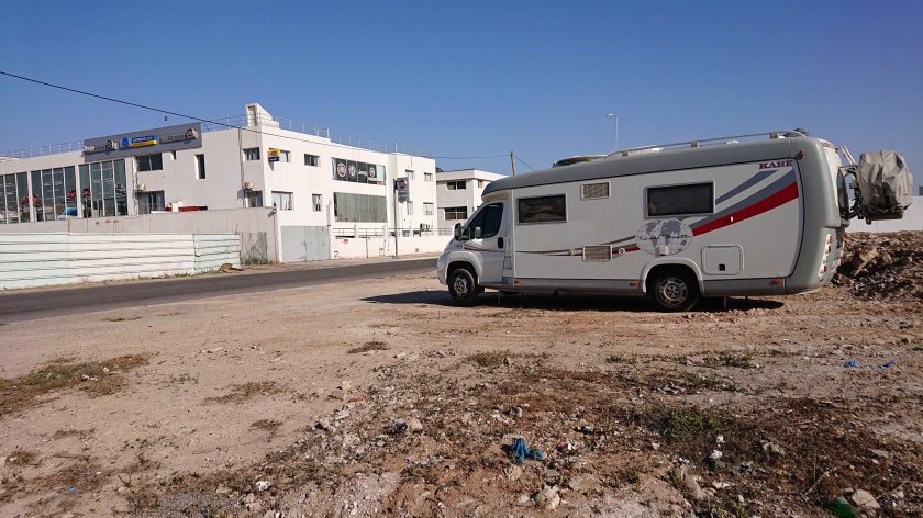 Stannar vid Marjane, denna affären ligger trångt till och är i två våningar. Framme vid 13:00 så vi åt en lätt lunch på två små snabbpizzor i deras snabbmatsrestaurang. Handlar mat och kör sedan till Fiatverkstaden och ställer oss på en ödetomt mittemot verkstaden. Vi har ju varit här förut så vi visste att man måste hänga på låset i morgon bittida för att få en tidig service.