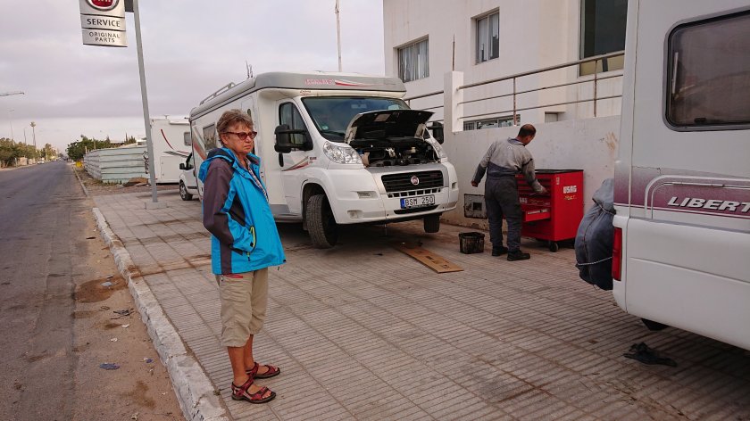 Det dröjde länge innan vi fick något besked om drivknuten. Men det fanns inga original fiat drivknutar i hela Marocko enligt kundmottagaren och att beställa en från Italien skulle ta 30 dagar? Jag betalar servicen, enligt fakturan 5 litet olja, oljefilter, luftfilter, diselfilter och bromsolja samt en timma debiterad arbetstid på totalt 2178:50 MAD. Samma i svenska kronor. Men det viktigaste blev inte gjort. Funderar på om vi skall avbryta Marocko resan och köra till Spanien och byta drivknut då man inte törs köra med en defekt bil till öknen.