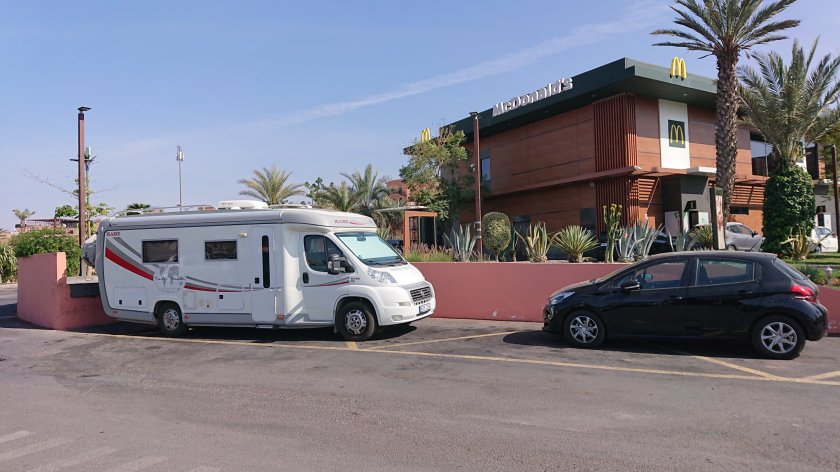 Vi kör motorvägen norrut och stannar på en rastplats och fikar. Två kaffe med färdiga smörgåsar och här var det internationella priser. 124 MAD för fikat. Vi beslutar nu att köra till Fiatverkstaden i Marrakech och kolla om dom kan fixa drivknuten. Vi var ju där för två år sedan och gjorde service. Kundmottagaren här pratar utmärkt engelska och konstaterar snabbt att någon drivknut inte finns tillgänglig i Marocko. Med det finns ett garage inte långt härifrån som kan byta drivknut. Han ringer en mekaniker och vi kom överens om att mötas vid McDonalds som ligger alldeles intill.