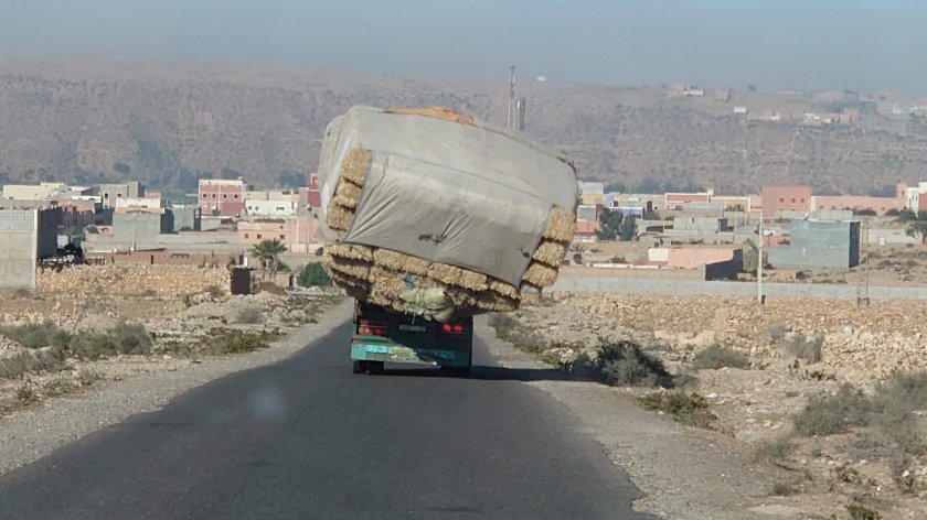 På vägen ner mot byn Arhbalou. Livsfarlig överlastVi kör ut på väg N1 söderut och viker av genom byn Arhbalou där vi kom på smala gator. Framme vid campingen vid 11-tiden. Det är soldis och omkring nitton grader i skuggan.