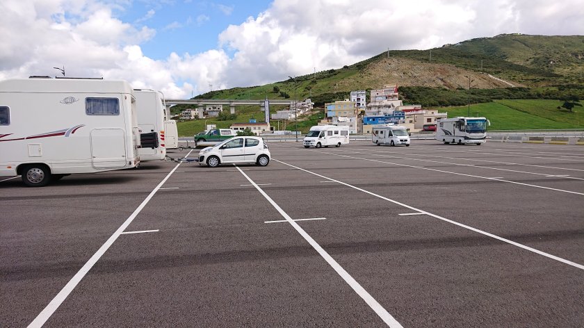 De sista 38 milen på motorvägen gick mycket bra då det inte var någon trafik bara enstaka lastbilar. Nu blir det också varmare med sol och några regnskurar. Betalar vägavgift på 56 MAD innan Rabat. Innan Tanger Med fick vi betala 148 MAD och visa upp biljett till färjan för att få köra vidare. Tankar sedan en sista gång och nu kostar dieseln 7:35/liter. Vi ser från motorvägen ställplatsen där alla husbilarna står som skall med färjan. Till slut hittar vi dit och bilen sprejas med någon typ av decinfektionsmedel samt fotograferas liksom våra pass. Blir sedan tilldelad en plats med el.