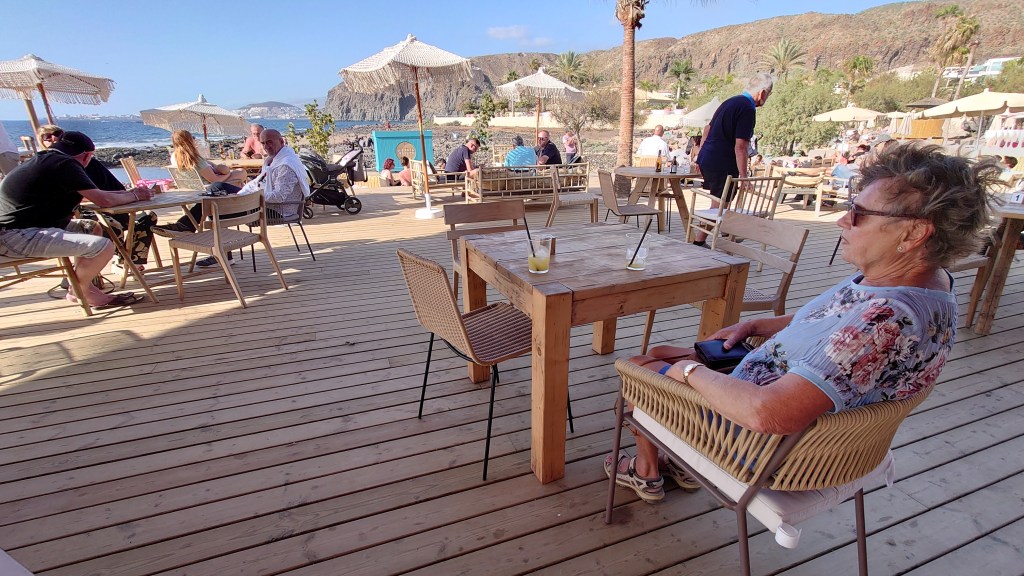 Går sedan en kort promenad genom Palm-Mar och köper varsin apelsinjuice vid ett café på stranden. Middag i bilen.