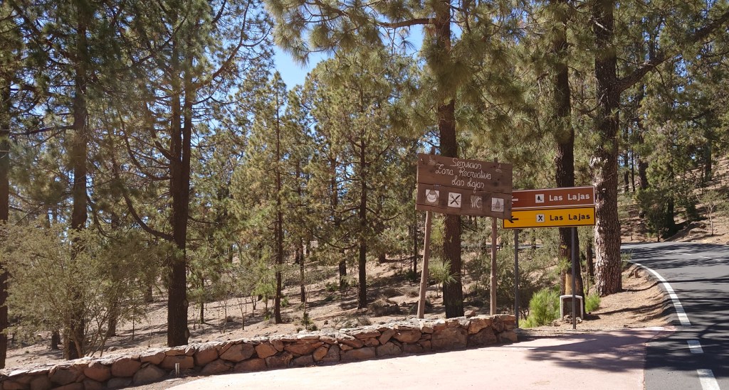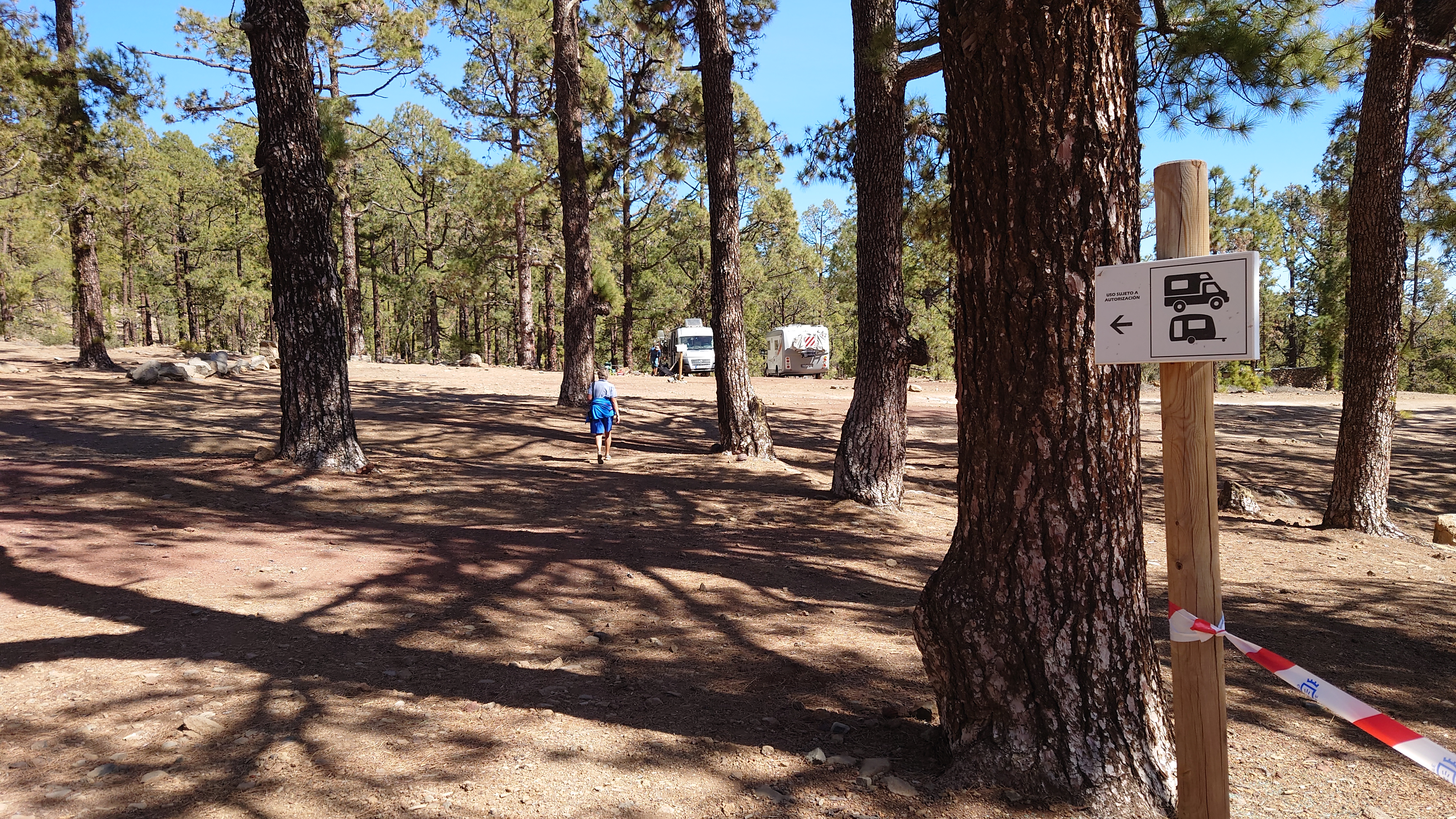 Vi var här också i november 2019 så vi känner igen oss. Många kanarier grillar vid de iordning gjorda grillplatserna. Ett litet område är till för husbilar och där står en plåtis från Ungern redan. Vi blir visade dit av en typ parkarbetare. Det är ingen internetuppkoppling vid husbilen. Parkarbetaren kom och frågar efter reservationsnummer. Vi hade inget sådant och parkarbetaren talade bara spanska. Ungraren intill talade bra engelska och han förklarar att plats på denna kommunala camping måste bokas på nätet om man stannar över natten. Jag får adressen till hemsidan som man bokar på. Parkarbetaren rycker på axlarna och knallar iväg. Vi gör lunch och intar denna utanför bilen i härligt solsken på omkring 2000 m.ö.h.