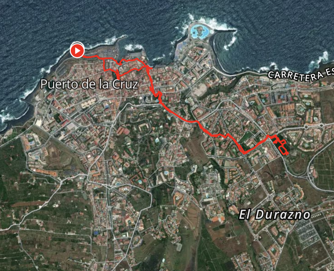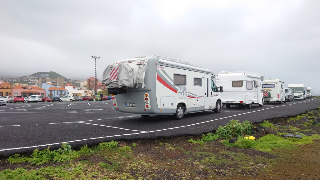 Vi lämnar parkeringen i Erjos vid halvtio tiden. Det är mulet, dimma och småregn samt +11 grader. Kör mot Puerto de las Cruz och en parkering vid gamla hamnen. Stannar i vid ett serviceställe strax innan för att tömma o fylla på med vatten.