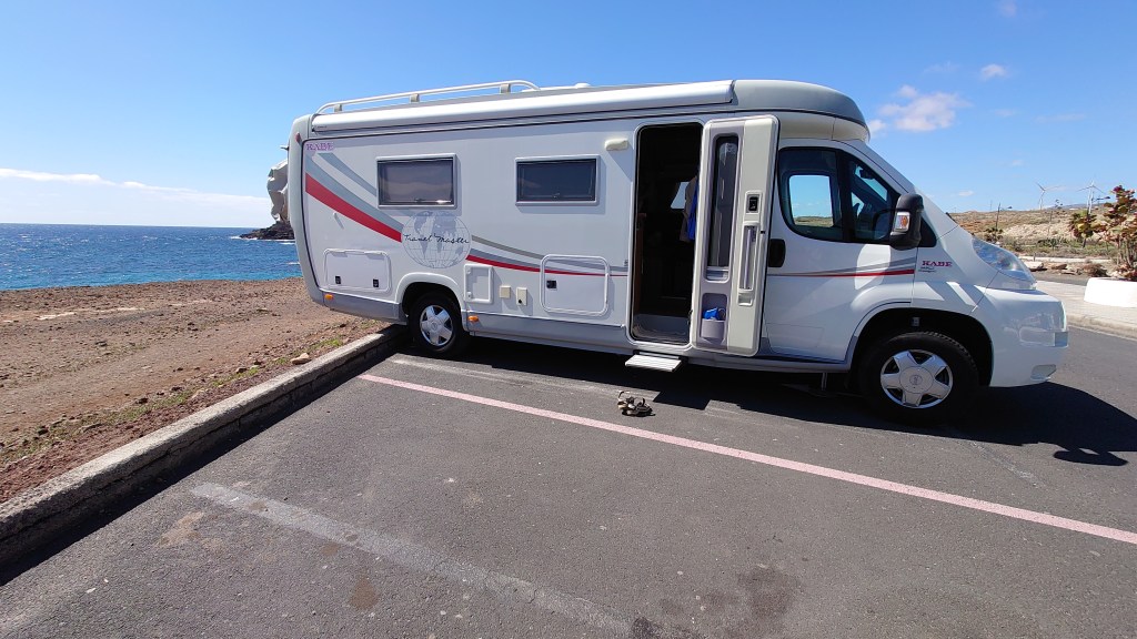 Det är mulet på morgonen och blåser som tidigare. Vid niotiden går vi till en närbelägen minimarket och handlar lite smått. Vid tiotiden lämnar vi parkeringen i Abades för att köra till camping Punta de Sordo, inte långt härifrån. På vägen dit, bara 3 km bort, stannar vi vid en Cepsa bensinstation, där man kan fylla o tömma vatten. Sedan var det bara 3,5 km till campingen och de sista 600 meterna på mycket dåligt grusväg. Checkar in och betalar 13:91€ för en natt utan el. Det finns en övre plats i lä bakom en klippa men vi valde platsen nere vid stranden.