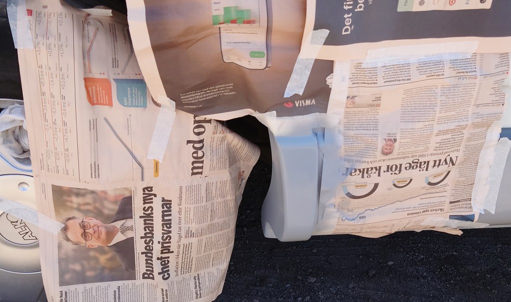 Middag utanför bilen i härligt solsken. Nyheter på TV:n