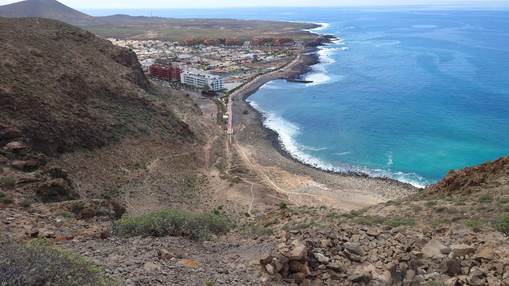 Mycket folk på stigarna. Väl uppe bestämmer vi oss att fortsätta till Palm-Mar och följer stigen till den mycket branta nerfarten. Här fick man inte vara höjdrädd då det stupade rätt ner och var stenigt.