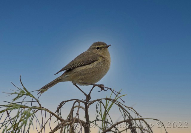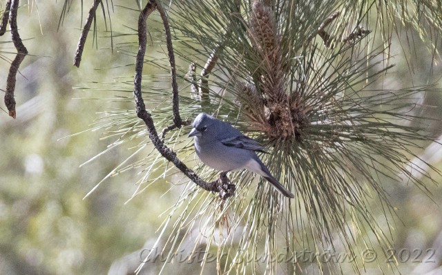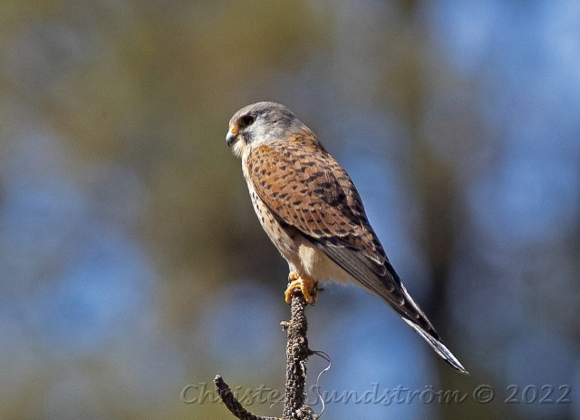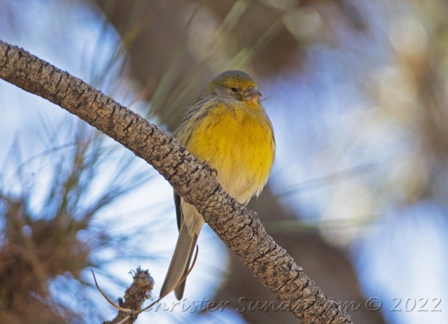 Kanariesiskor håller till vid picknick området och i motljuset ses en bofink. Oklart vilken, men snart förstår vi att det är den blå bofinken. En tornfalk flög plötsligt och satte sig i en låg tall. Två större hackspettar jagar varann. Fick hygglig bild på den blå bofinken på långt håll. Märkte att på en liten öppen yta var det internetuppkoppling och jag lyckades boka en plats och få ett bokningsnummer. Det är ju gratis att stå här. Lite kylig i luften med skönt i solen. Ett äldre engelskt par är också här för att fågelskåda.