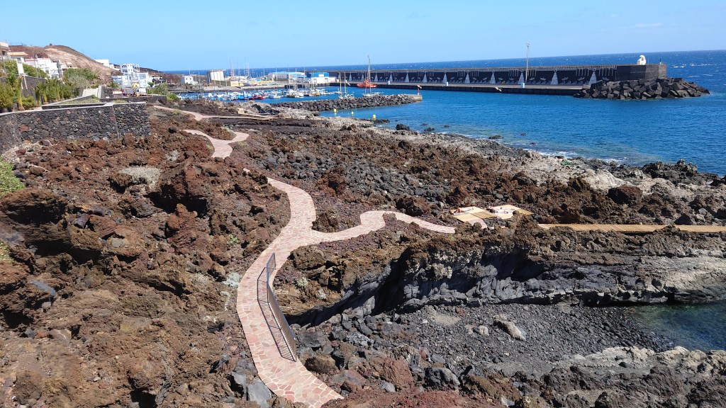 Framme vid parkeringen i La Restringa vid 13-tiden. Det är full sol och blåser kraftigt. Vi ställer bilen så det blir lä på höger långsida. Vi gör lunch och går sedan en promenad mot hamnen. Bra badstrand från lavaklipporna med stege ner och promenadstråk byggda av trä.