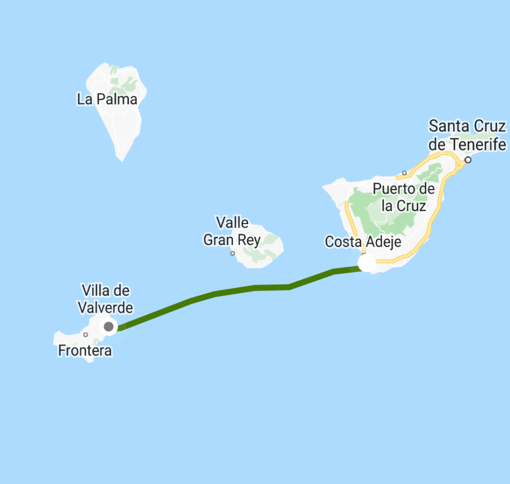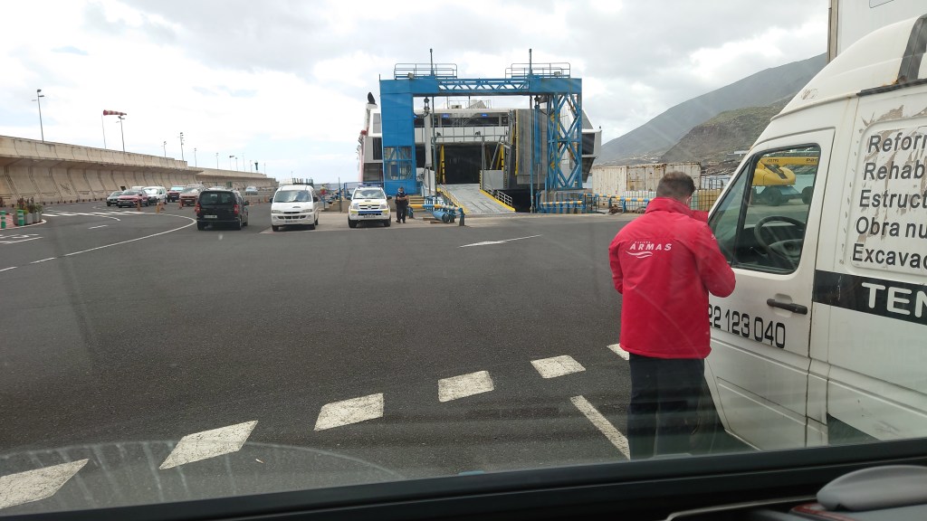 Det är mörkt då vi anländer 20:00 till hamnen på El Hiero och när vi kör av är det samma visa trots mycket försiktig körning av färjan tar överhänget i igen. En parkering ligger precis vid hamnen så där parkerar vi för natten. Små platser så vi står på tvären över tre rutor. Vi åt ju lite på båten så ingen middag i bilen. Nyheter och Benjamin på TV:n