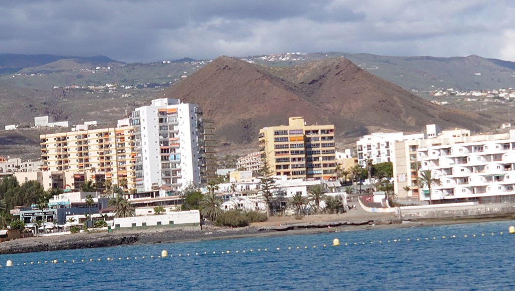 Incheckningen fungerar smidigt och redan 13:00 kör vi ombord. Glest med passagerare så vi sitter vid baren under färden. Det gungade ganska rejält denna gång också. 16:30 är vi framme vid hamnen i Los Cristianos och kör till ställplatsen på Calle Caleta där vi varit ett flertal gånger. Flera platser lediga och den längst upp var också ledig. Vid 18-tiden går vi till Restaurang Los Tarajales som ligger efter strandpromenaden och äter en trerätters middag med en flaska vitt för 32:75€. Sedan nyheter och Strömstedt på TV:n