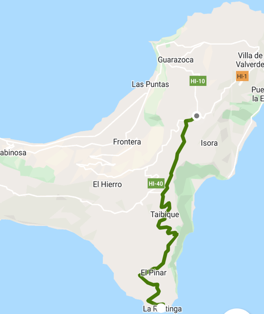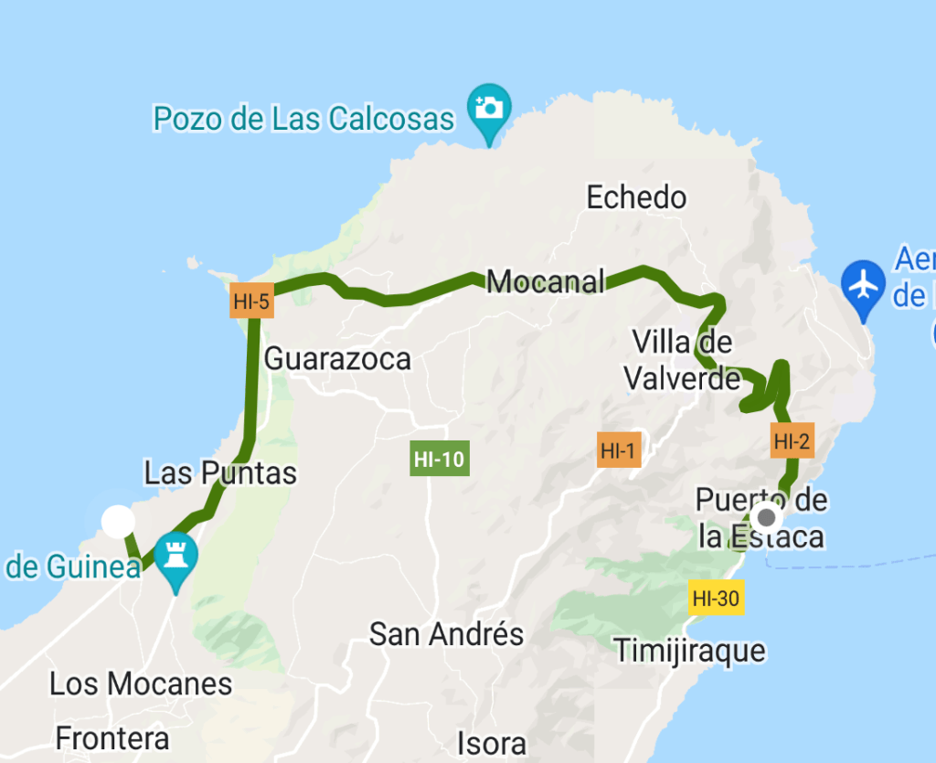 Växlande molnighet, blåsigt och omkring +17 grader då vi vid niotiden lämnar parkeringen i Puerto de la Estaca och kör väg HI-1 till Villa de Valvelvde.