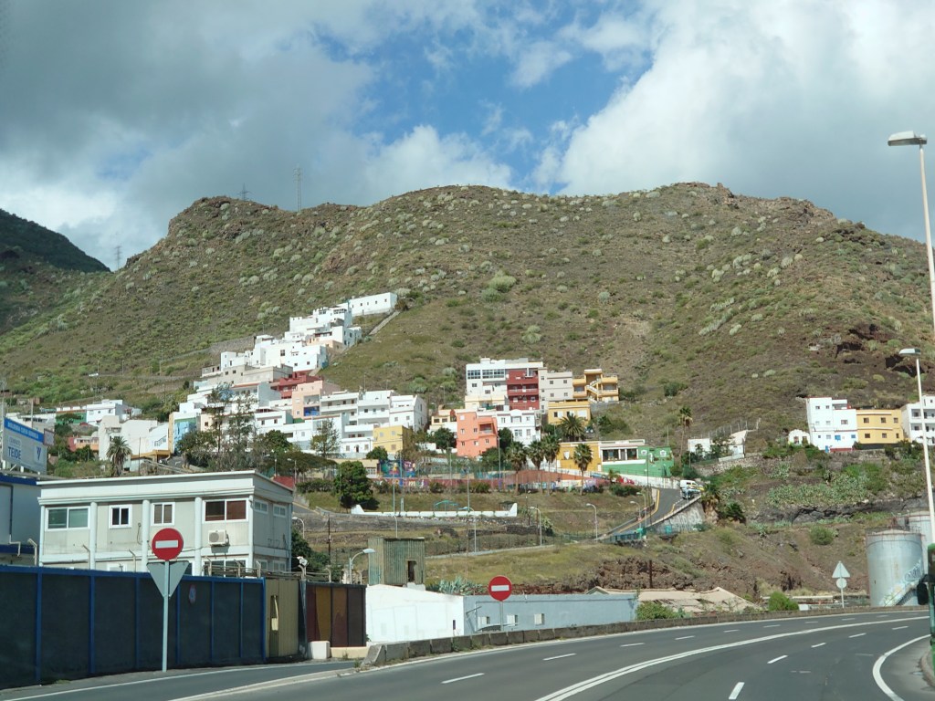 Vi lämnar parkeringen vid hamnen i Puerto de la Cruz vid niotiden för att köra till Playa de las Teresitas norr om San Andres på östra sidan av Teneriffa därför att där borde det vara lä från vinden. Vi var ju där de första dagarna på Teneriffa för en och enhalv månad sedan och nu blir vi där de sista dagarna på Teneriffa också innan färjan till Huelva går den 7 april. Det blåser in från havet men är uppehåll då vi först passerar vi serviceplatsen i El Toscar för att tömma o fylla på med vatten. Vi behöver också tvätta och en tvättinrättning som såg bra ut ligger i San Cristobal de la Laguna efter vägen till San Andres. Vi kör väg TF-5 innan vi svänger av in mot Cristobal.