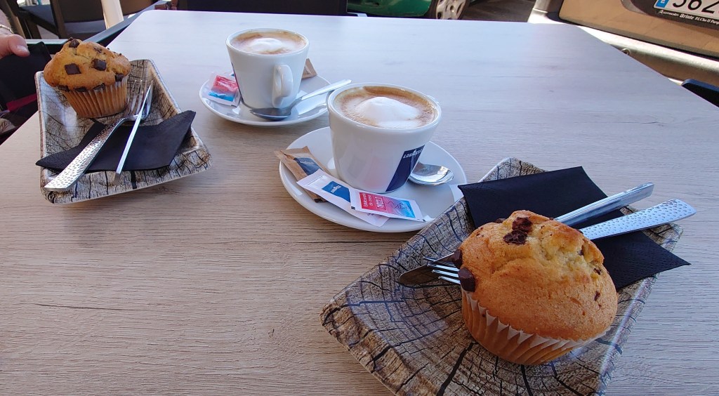Vi beställde varsin cortado med chokladmuffins på en av barerna. Återvänder till bilen och tar det lugnt. Efter lunch går vi till stranden och hyr solstol samt badar. Grön flagg i dag så det var minimala vågor. Vid 16-tiden gick solen i moln och det blev lite kyligt. Vid 18-tiden grillar vi fläskfilé då solen tittade fram igen. Sedan nyheter och Let’s dance på TV:n.