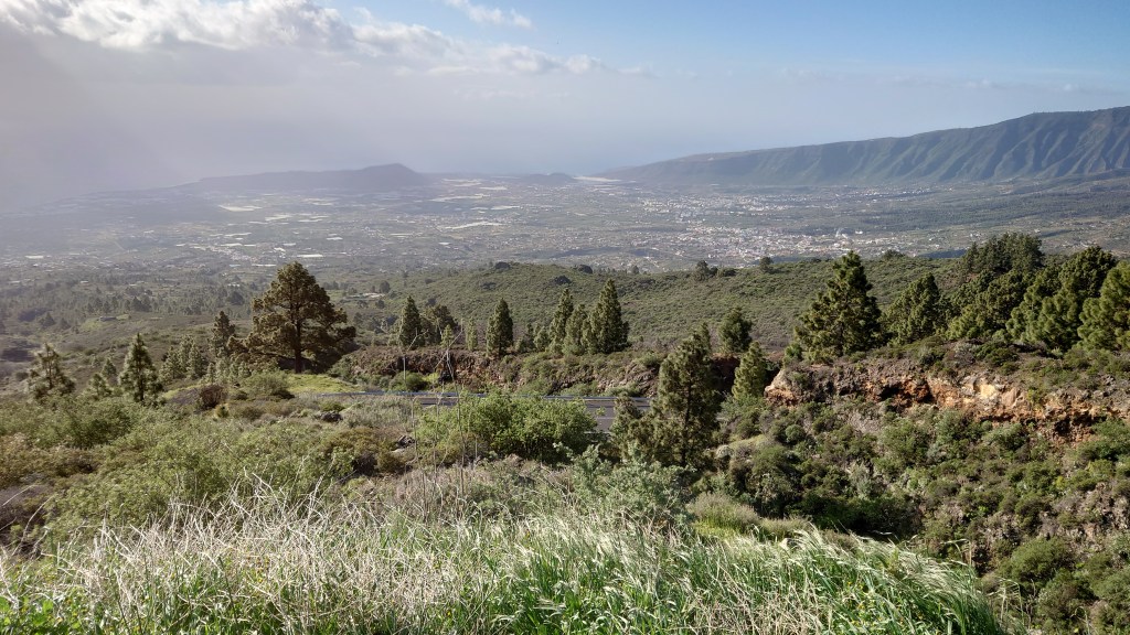 Vi lämnar vi parkeringen i Puertito de Güìmar vid niotiden för att köra till Los Cristianos igen då det väntas bästa vädret där. Eftersom det är helt klart över bergen tar vi vägen upp och förbi Tejde. Kör först till serviceplatsen, vid Disa macken i Güìmar för att tömma och fylla vatten. Tankar också 51,93 liter á 1,438€/ totalt 74,74€. Kör sedan väg TF-523 uppför berget. Fantastiskt utsikt, då vi kommer upp i tallskogen blir det blir dimma.