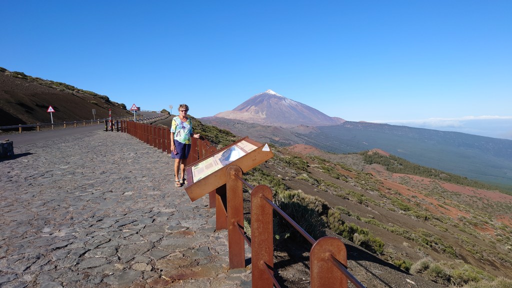 Det är också kallt, bara +7 grader. Kommer sedan in på väg TF-24 som går upp till högplatån där det bara växer låga buskar. Dimman försvann och det är sol från klarblå himmel. Fin utsikt mot Tejde.
