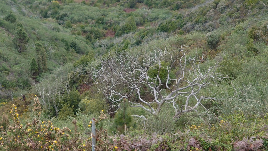 Vi lämnar 72-timmarsparkeringen på Calle Caleta i Los Cristianos vid tiotiden. Det är mulet och omkring 20 grader. Vi kör mot Erjos och tar TF-1 till Santiago del Teide och sedan TF-42 över berget där högsta punkten är 1132 m.ö.h. Det är mulet och lite regn hänger i luften då vi kommer fram till parkeringen i Erjos. Det är bara 14 grader här på 1000 m.ö.h men ingen vind. Vi var ju här för en månad sedan också och nu gör vi ett nytt försök att se de endemiska duvorna och kungsfågel. Denna gång går vi efter den lilla vägen fram till lagerskogen.