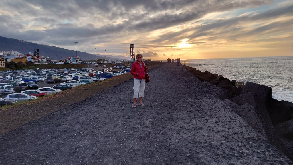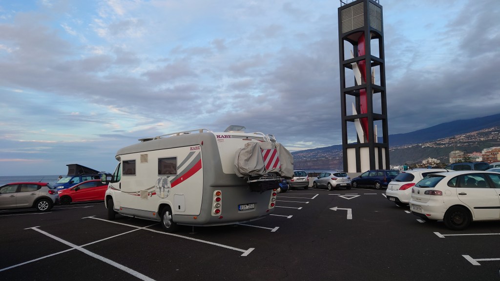Vi stannar på parkeringen i Puerto de la Cruz i dag. Redan 04:00 kommer en stor hop festande ungdomar tillbaka till parkeringen och fortsätter att tjoa, spela hög musik och föra oväsen ända tills 06:00 då de flesta droppar av och det blev lungt igen. Jättefin morgon med sol och vindstilla.