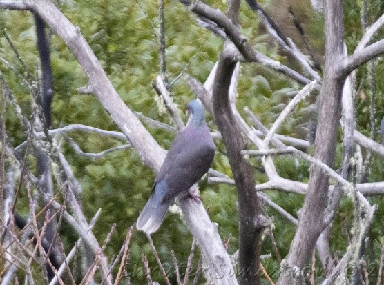 Ser koltrast och rödhake samt kanariesiska efter vägen och då vi kommer fram till en utsiktsplats över dalen sitter 4 kanarieduvor och en lagerduva i ett torrt träd.