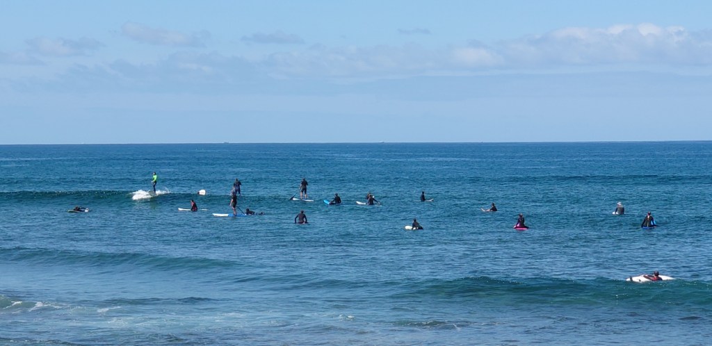 Grön flagg i dag och små vågor så inga problem att bada. Vi har trekaffet med i termos som avnjutes på solstolen. Efter 16:00 återvänder vi till bilen. Grillar kyckling igen nu med en flaska rött utanför bilen i en lite kylig kväll. Nyheter och Masked Singer på TV:n.