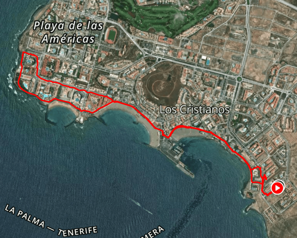 Vid elvatiden promenerar vi till Deutsche Bank och sedan genom centrala Los Cristianos till Playa de las Vistas.