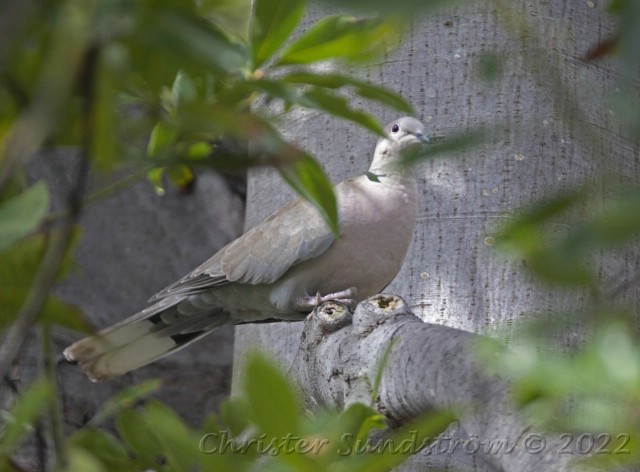 Kanariesiskan höll sig högt uppe i de höga träden. Plötsligt sitter en turturduva högt uppe i ett träd. Turkduvor flyger omkring bland träden.