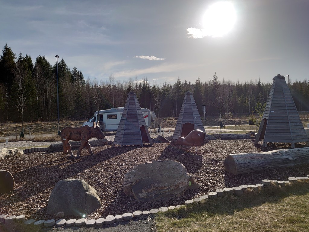 Går en kort promenad till receptionen för älgparken men den hade stängt 17:00. Middag i bilen och nyheter samt Benjamins på TV:n