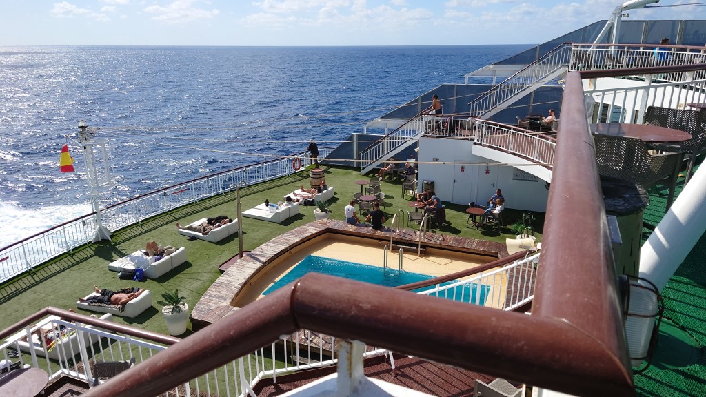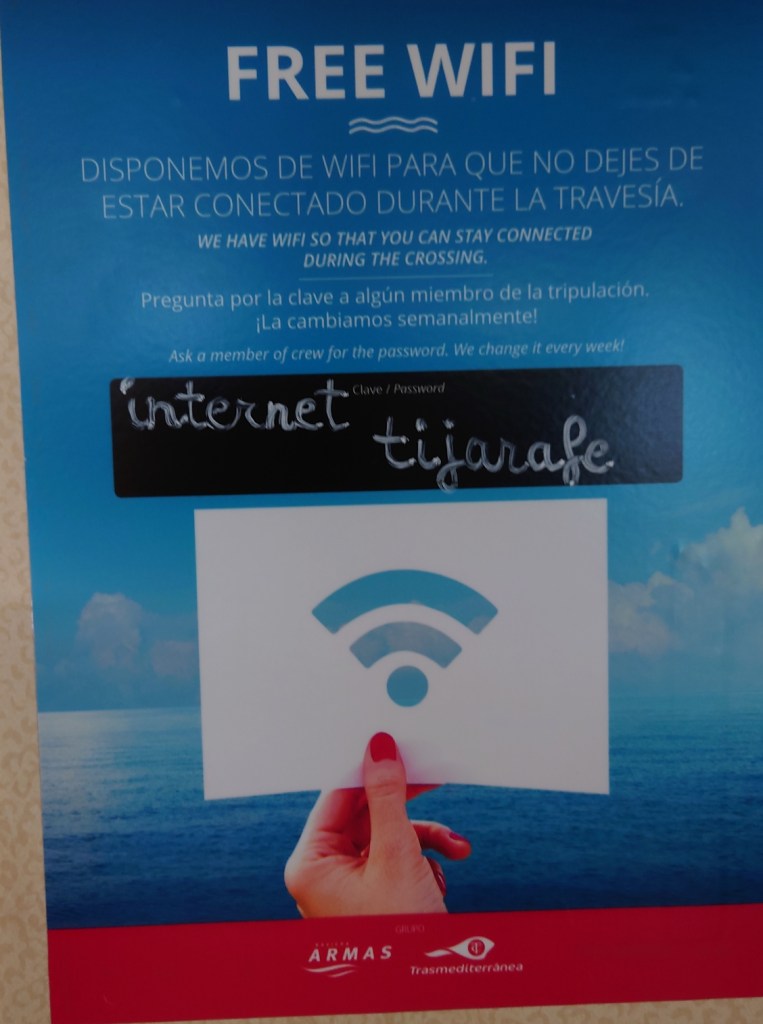 Fortsätter sedan till färjeterminalen där färjan Volcano Tinamar, byggd 2011, väntar på oss. Framme i god tid 09:00. Incheckningen går smidigt då vi sitter kvar i bilen. 11:00 kör vi ombord och får en bra hytt på plan 7. Färjan Volcano Tinamar avgår på utsatt tid 12:00. 13:00 är det lunch. Mat ingår i priset för hytten.