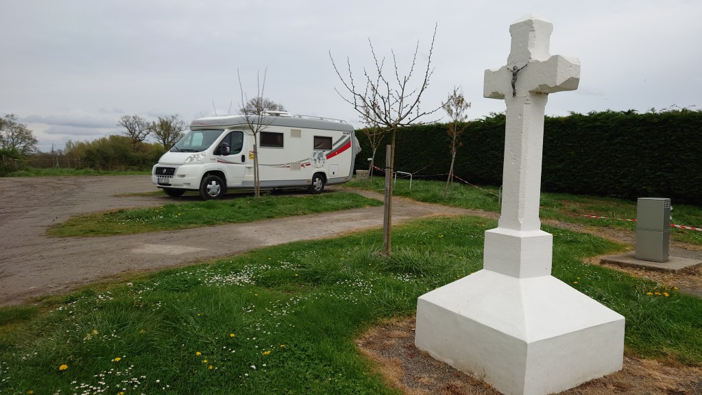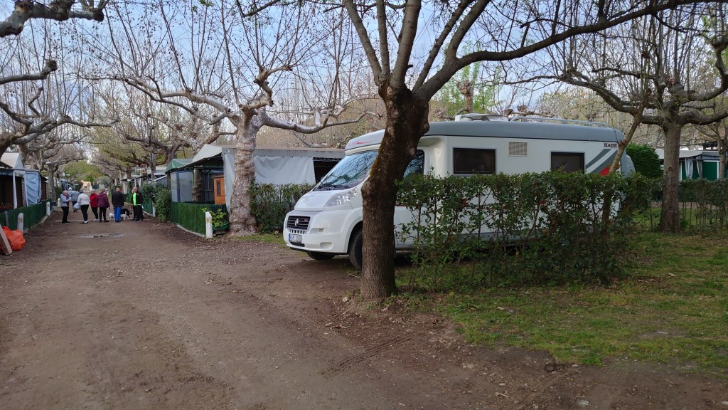 Den var också full men vi ställer oss i utkanten mot en gropig äng. Framme vid 16-tiden. Solen skiner och det är riktigt varmt så vi sitter ute en stund och smuttar på en sangria. 18:00 kom platsvärdinnan och tar betalt. 11€ för en natt utan el. Påskmiddag i bilen samt nyheter och Mask Singers på TV:n.
