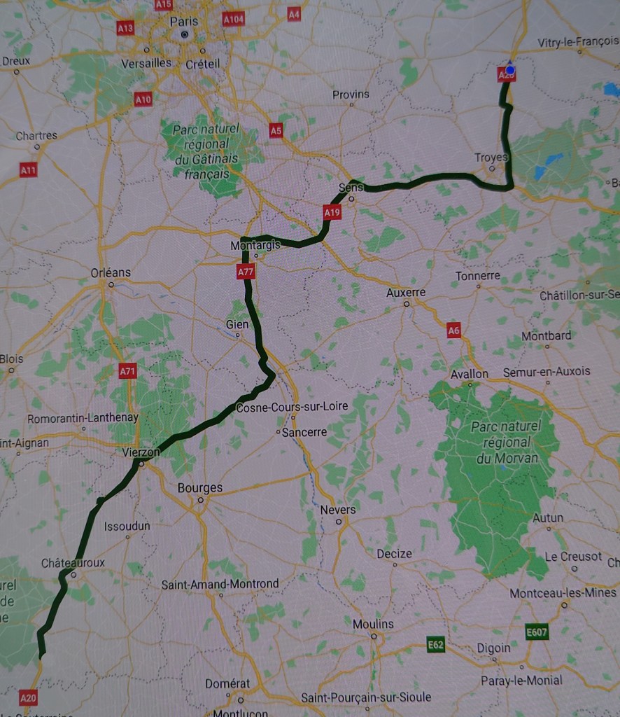 Vi lämnar ställplatsen vid Bazaiges 08:30 och kör mot Mailly-le-Camp där en bra plats före övernattning finns, drygt 40 mil NO. Vi tar mindre vägar rakt på istället för motorvägen. Det fungerar bra ända tills en väg var avstängd och vi måste ta en lång omväg. Då blev det lika bra att ta motorvägen som blev längre.