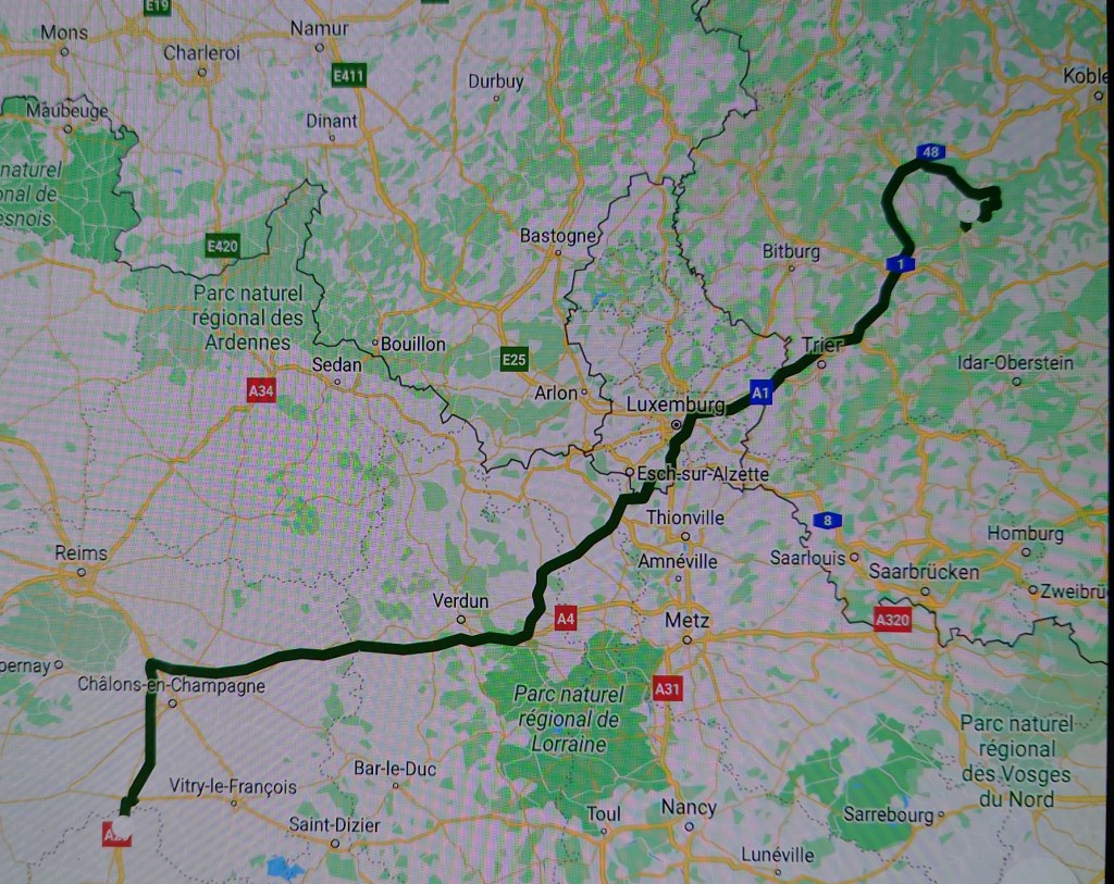 Vi lämnar Mailly-le-Camp 08:30 för att köra till Moseldalen och en ställplats på en vingård. Vi kör via Luxemburg och tanka fullt där då disel alltid är billigare där.