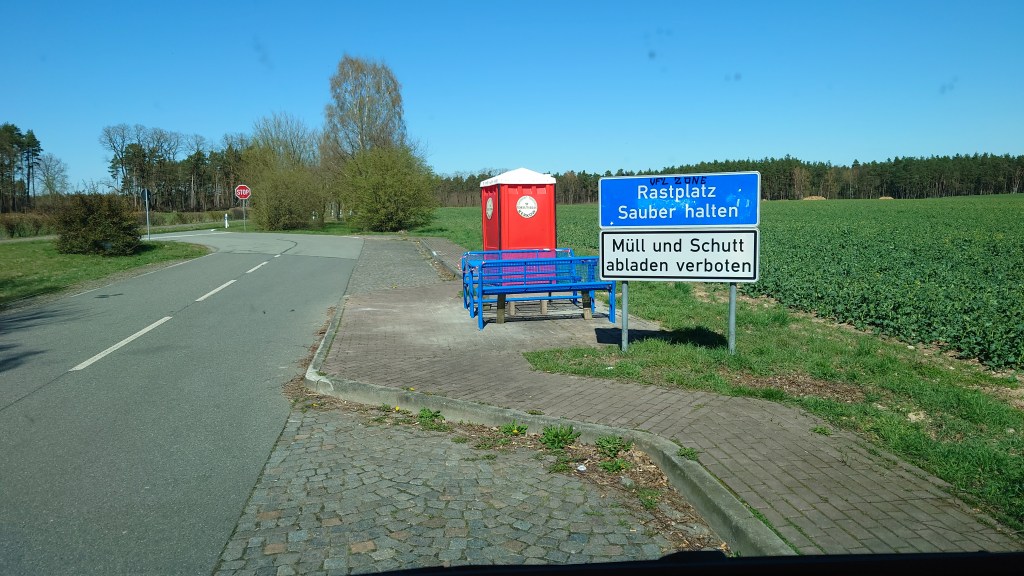 Ganska lite trafik då inte långtradare får köra på söndagar. Tar av in på motorväg A7 där vi kör in till Aral bensinmack vid Northeim. Såg knepigt ut vid macken så vi besökte Burger King istället och beställde varsin kaffe med Do Nuts till. Fortsatte efter A7 till Salzgitter där jag tankar LPG gas vid Aral Tankstelle, 36,48 liter á 1,159€/l Totalt 42,51€. Kör sedan småvägar och stannar vid en rastplats då, klockan blev 13:15, och ågör lunch i bilen.