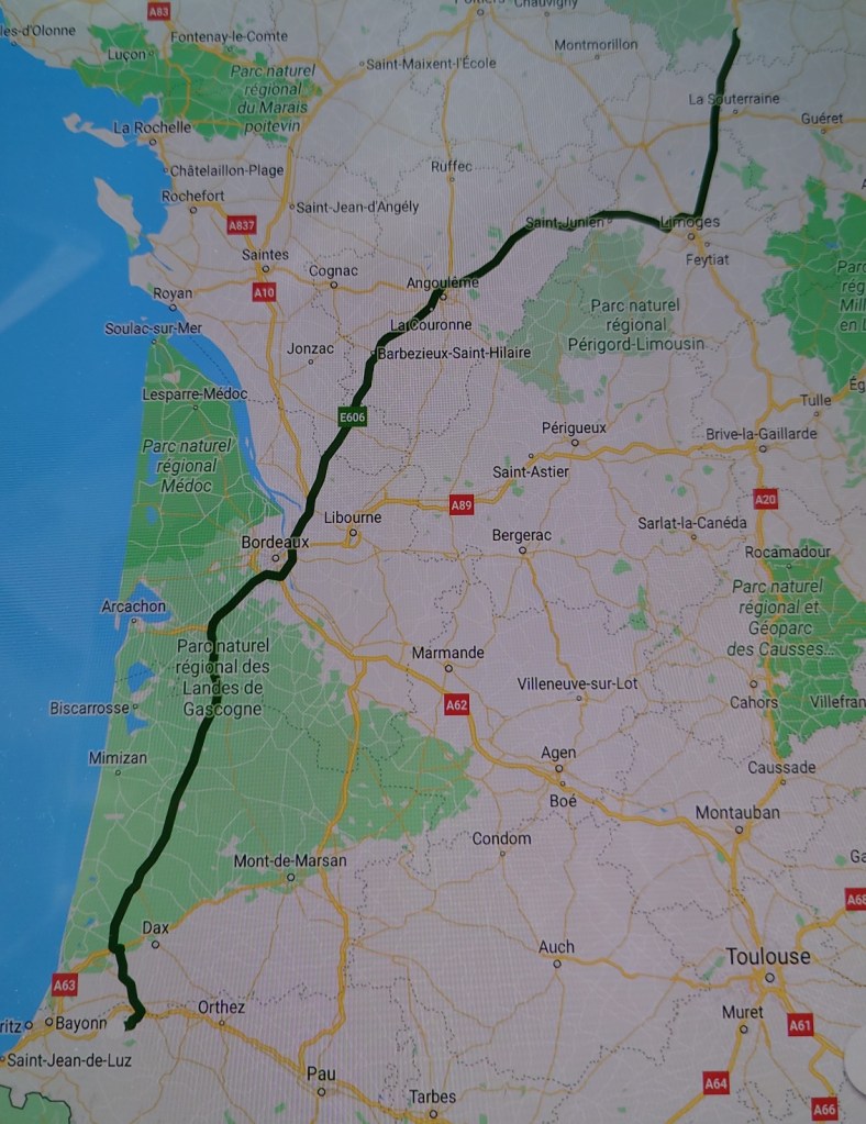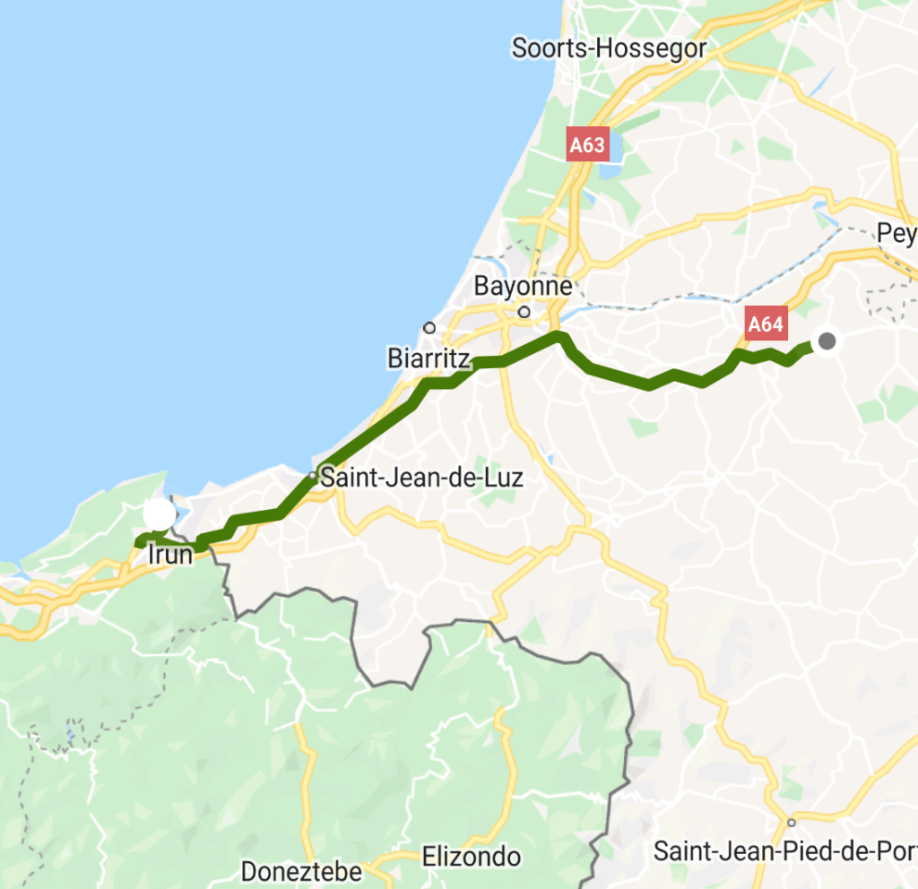 Vi går en sväng i utkanten av Irun och vid 18-tiden gör vi middag i bilen då en polis kom och sade att här får vi inte stå över natt då lastbilar kommer. Han hänvisar till en plats i Hondarriba 1,5 km bort. Vi äter och diskar och kör till platsen i Hondarriba men det var fullt med husbilar på en inhägnad plan. Vi siktar då på en ställplats på franska sidan i Saint-Jean-de-Luz. Knappt 20 km dit. Kör först och tankade vid Easygas Hondarribia, 40,48 liter diesel á 1.519€/l totalt 61,49€. När vi kommer till ställplatsen var den helt full med husbilar och tätt packade. Vi kör vidare ut på motorvägen A63 och tänker stå med långtradarna på en rastplats. Den första vi kom till var helt fylld med långtradare. Det var bara att köra vidare. Nu till en plats ut på landet drygt 30 km bort. Det börjar mörkna och klockan är 21:00 då vi kom fram till ställplatsen i Bardos.