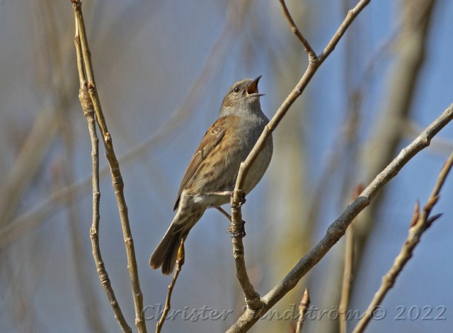 Fullt med bilar så vi ställer oss tvärsöver rutor. En svensk plåtis med reg skylt ÄLGEN, står redan där. Solen skiner men kyligt i luften. Vi går en promenad på stigar efter sjön. Ser en järnsparv så jag gick tillbaka efter kameran.