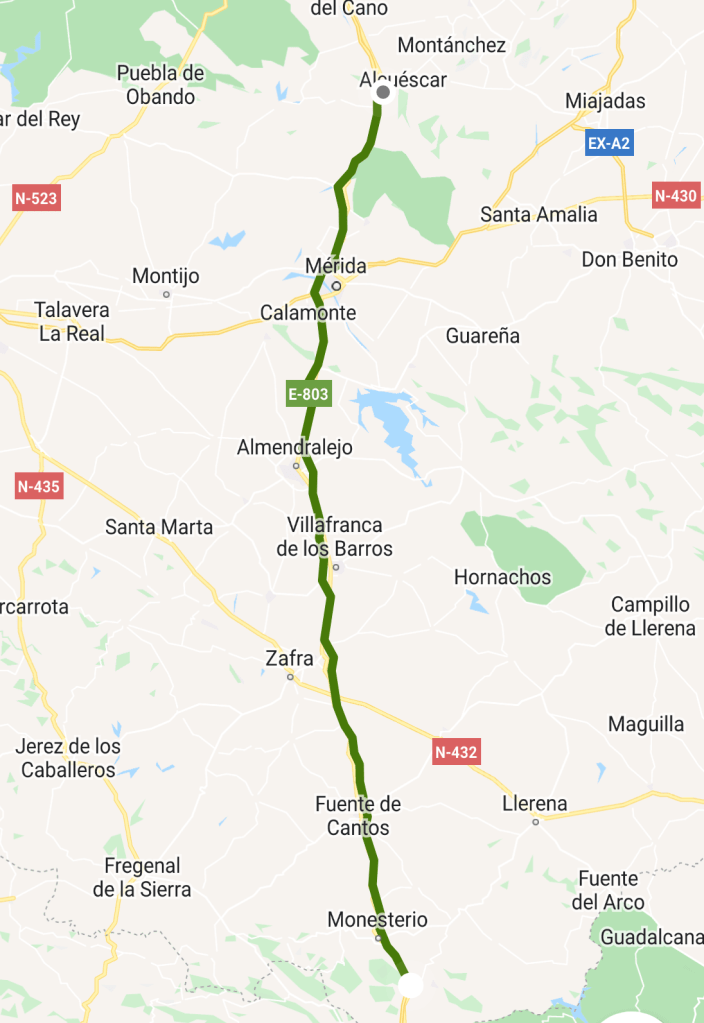 Vi lämnar den kommunala ställplatsen i Gibraleón 08:30 för att köra till en ställplats i Bejer 45 mil.norrut. Vi kommer ut på väg A66 norr om Sevilla, Mestadels sol och omkring 20 grader. Inte så mycket trafik då det flyter på bra. Stannar vid en stor rastplats, Complejo Leo vid elvatiden och tänkte fika i restaurangen.