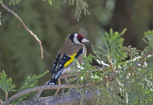 Ser steglits och gråsparv i en buske utanför bilen. Fortsätter sedan ytterligare 13 mil då vi stannar och gör lunch i bilen straxt efter 13:00.