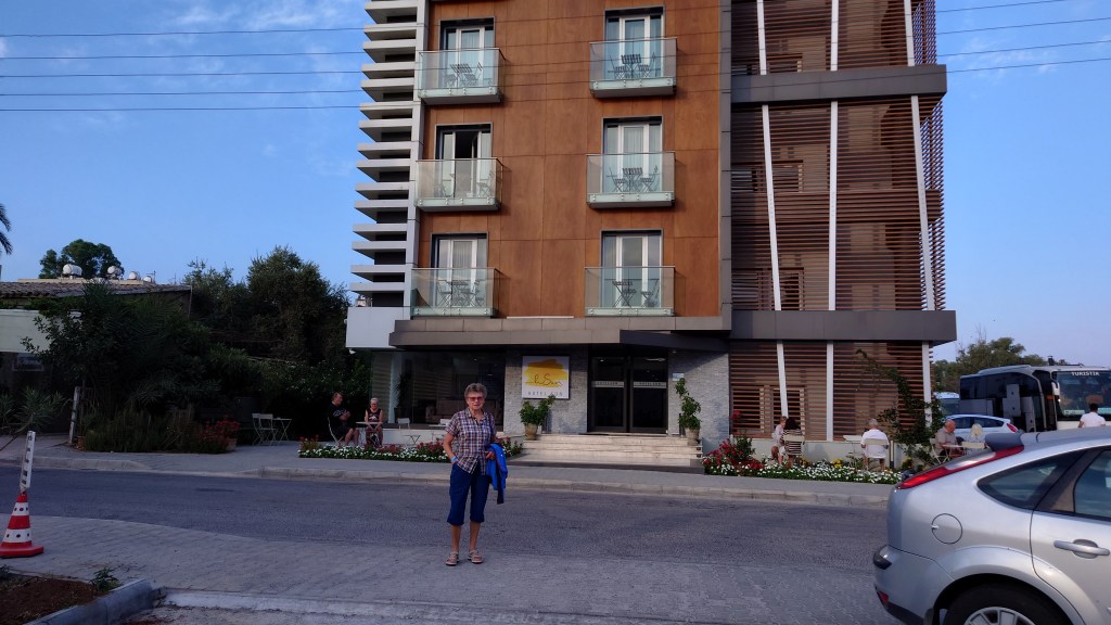Det gick sedan snabbt genom passkontrollen och väskorna kom fort. Vi letar oss ut till buss Nr 4 som kör oss till hotell Sun. Klockan var 20:30 och bussturen tog 30 minuter. En trevlig svensktalande turkcypriot blir vår guide under rundturen första veckan. Vi checkar in på bussen och får nycklar till rummet och ätband om handleden för första veckan. Vi går direkt från bussen till matsalen och äter en sen buffé. Mycket litet men helt OK rum.
