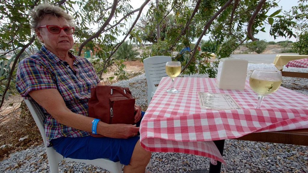 Fortsätter en dryg timme tillbaka och klockan blir 15:00 då vi stannar vid en restaurang. Några äter en sen lunch. Vi tog varsitt glas vitt under ett lövträd.