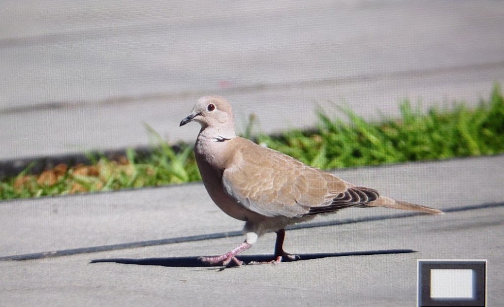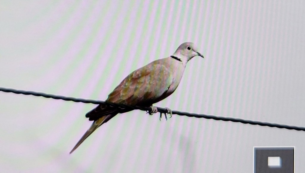 Vi väntar vid vägkanten på en ersättningsbuss. Ser en turkduva på långt håll sittandes på en elledning.