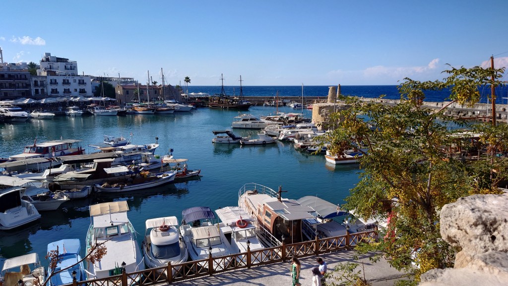 Fantastiskt utsikt mot Kyrenias hamn. Vi kollar utsikten och äter sedan lunch på en restaurang med utsikt mot havet.