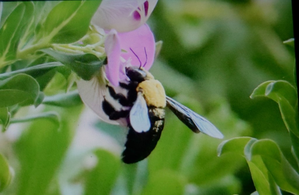 Ett snickarbi höll till i en blommande buske, som heter Myrtenjungfrulin, Polygala myrtifolia på vår altan. Sen middag som vanligt på hotellet.