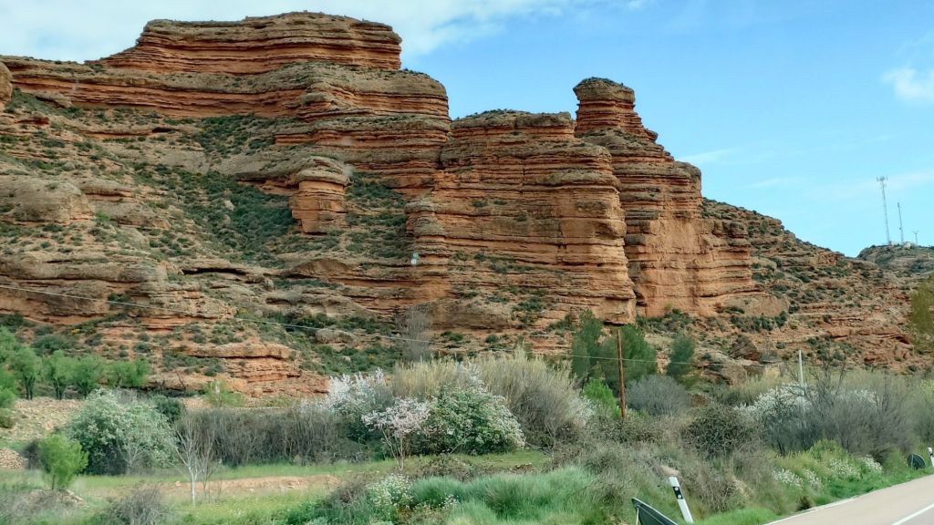 Efter lunchen tar vi väg A-220 mot Belchite som nu var mycket dålig och vägarbeten efter nästan hela sträckan. Vi kör till den kommunala ställplatsen där vi också var för 2 år sedan. Klockan blev ju 15:00 så vi tar trekaffet i bilen. Det var vått och lerigt på ställplatsen då det har kommit mycket regn i området. Efter trekaffet kör vi till naturområdet El Planeron.