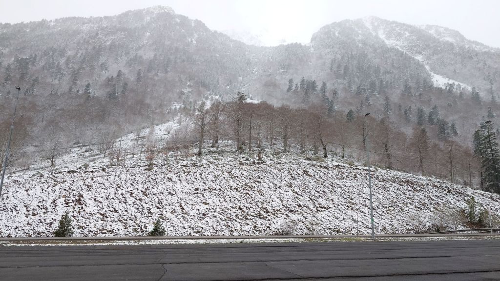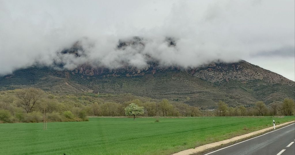 Regnar till och från hela natten och temperaturen nere på +4 grader som lägst. Vi lämnar Área de Autocaravanas de Viacamp vid niotiden och kör väg N-230 norrut. Det är uppehåll men mulet och låga moln döljer bergstopparna.