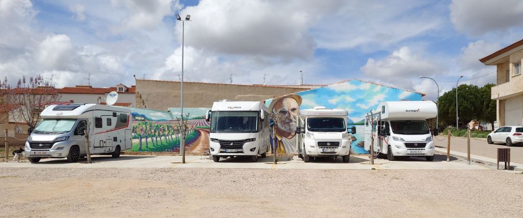 Klockan 11:30 stannar vi vid en bensinmack och dricker kaffe i bilen. Det blåser tidvis ganska rejält och kom lätt regn. Framme vid ställplatsen La Rambla 31 Calle Carrera Baja, strax efter 13:00. Ställplatsen har bara 3 platser och en var upptagen då vi kom.