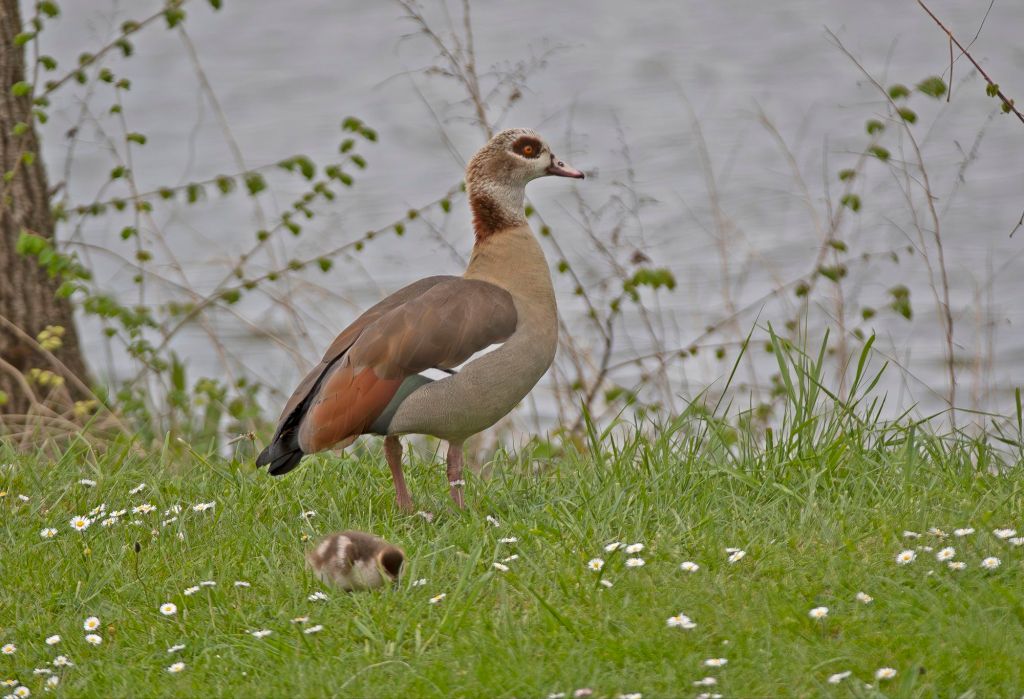 Mulet och kyligt. Birgitta går en promenad och jag kollar nilgåsen med dununge intill floden Mosel.