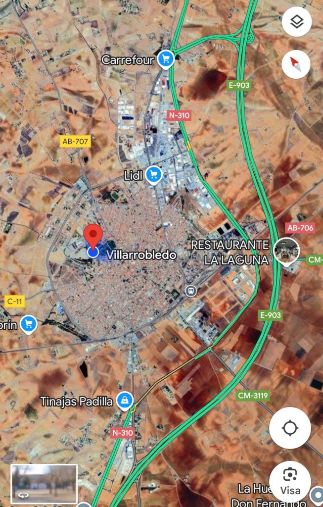 Olivodlingar dominerar. Strax efter klockan 11 stannar vi vid en bensinmack och tar varsin kaffe i bilen. Framme vid ställplatsen i Argamasilla de Alba, 5 Carretera la Solana-Tomelloso strax efter 13:00. 10 platser innanför en mur och stor järngrind. Inga bilar på plats. Såg inte så kul ut. Vi stannar och gör lunch i bilen och fortsätter sedan till en kommunal ställplats i Villarrobledo 5 mil längre fram efter motorvägen. Framme 14:30 vid den centralt belägna ställplatsen i Villarrobledo, 16 Calle de la Feria. 2 spanska husbilar på plats.
